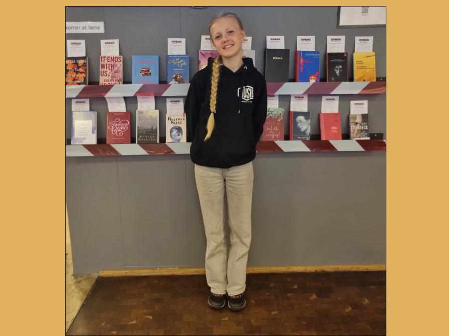Elisa gongur í 9. flokki í Skúlanum á Fløtum, og hon hevur í tvær vikur verið í starvsvenjing á Býarbókasavninum. Tað hevur verið stuttligt at havt Elisu í starvsvenjing hjá okkum, og vit takka fyri tíðina. Elisa hevur gjørt framsýningina Bannaðar bøkur.